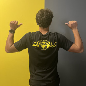 Marquage patch brodé ELDERA noir sur le devant, logo SMR en bas à gauche et visuel ENSEMBLE dans le dos.