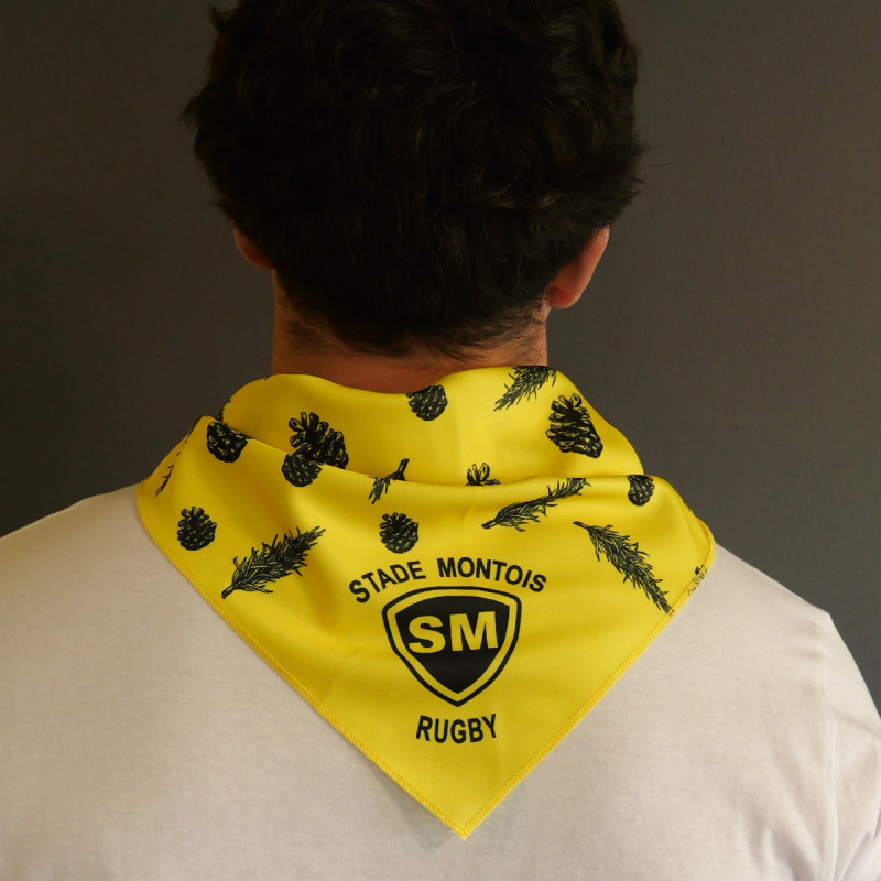 Foulard jaune et noir visuel pigne et branche de pin.