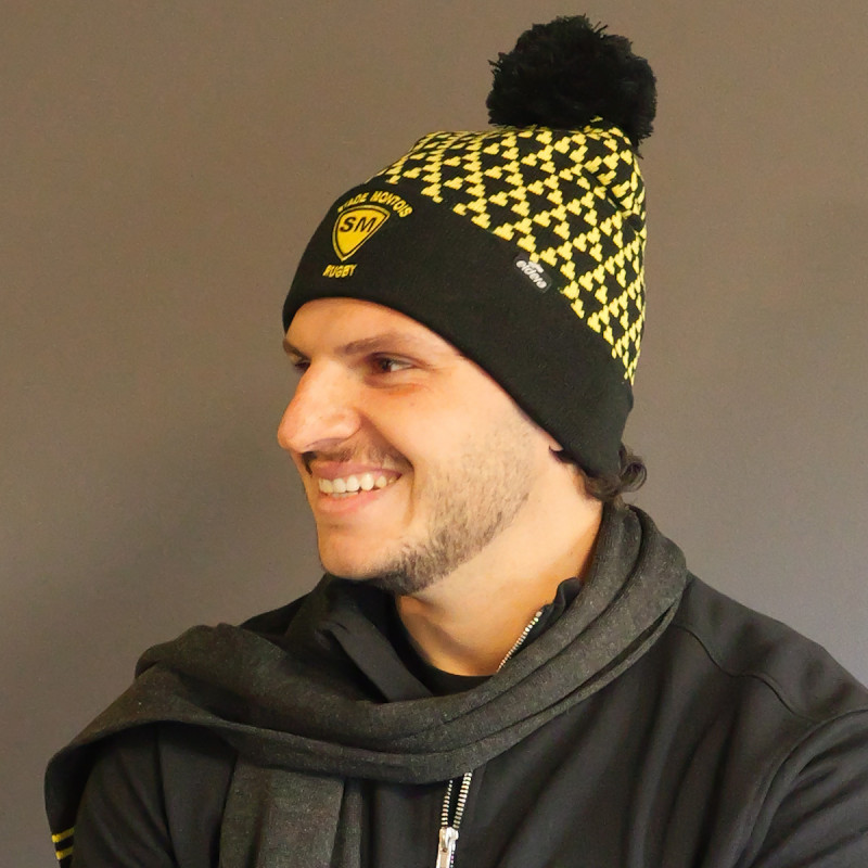 Bonnet "pied de poule" jaune et noir épais avec revers et pompon (possibilité de le découdre).
